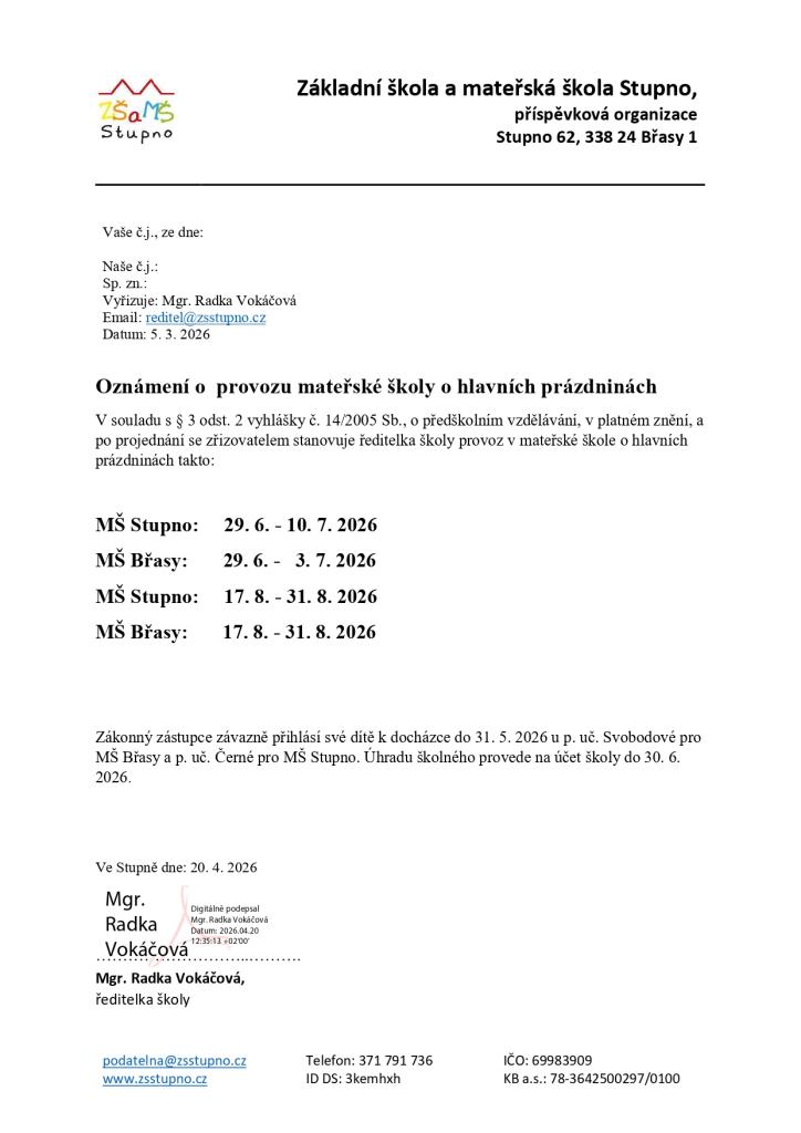 Výši úplaty za jednotlivé měsíce rodiče zjistí u vedoucích učitelek MŠ.