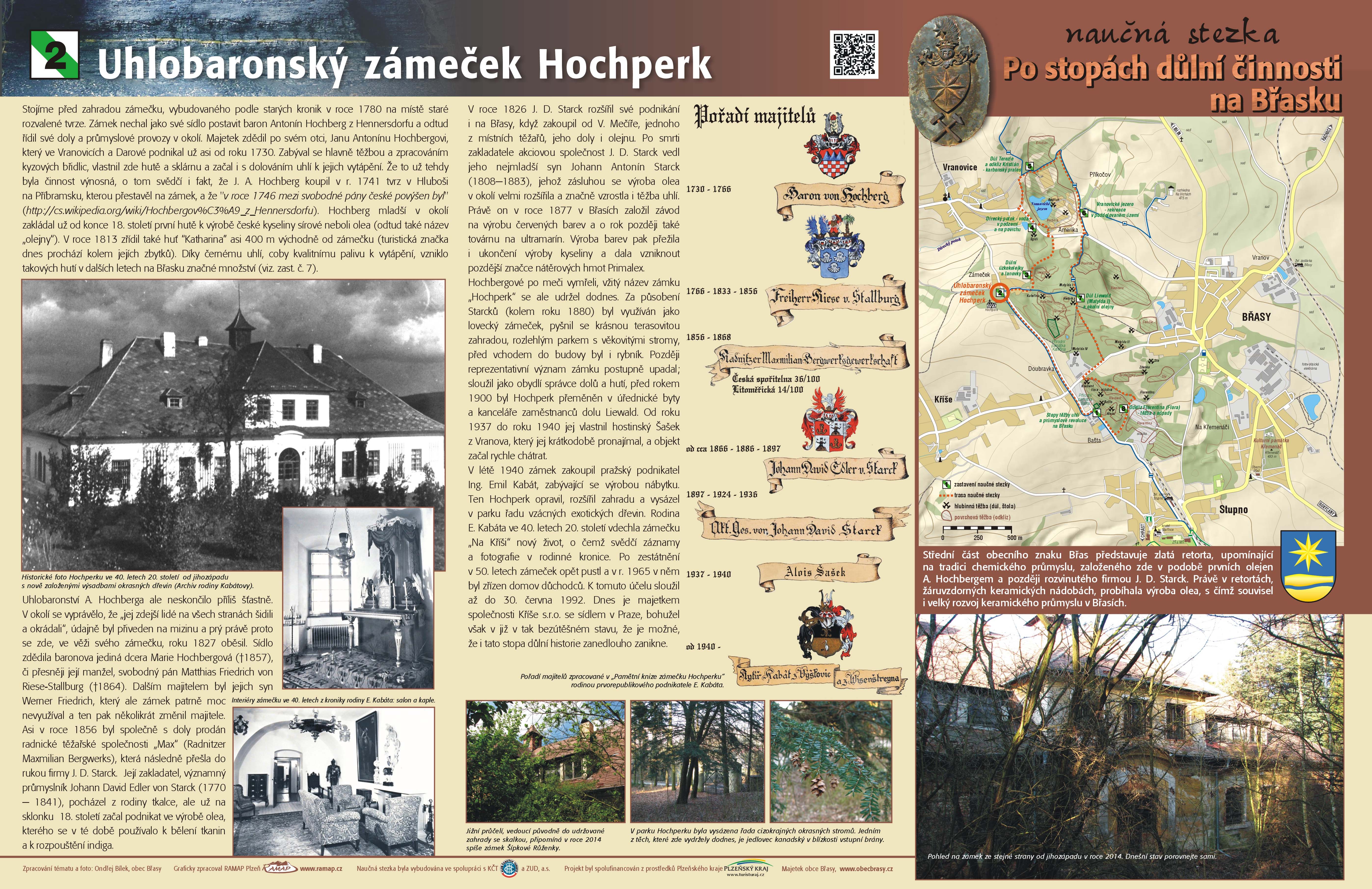 Zastávka se nachází před zahradou zámečku, vybudovaného podle starých kronik v roce 1780 na místě staré rozvalené tvrze. Zámek nechal jako své sídlo postavit baron Antonín Hochberg z Hennersdorfu a odtud řídil své doly a průmyslové provozy v okolí. Majetek zdědil po svém otci, Janu Antonínu Hochbergovi, který ve Vranovicích a Darové podnikal už asi od roku 1730. Zabýval se hlavně těžbou a zpracováním kyzových břidlic, vlastnil zde hutě a sklárnu a začal i s dolováním uhlí k jejich vytápění. Že to už tehdy byla činnost výnosná, o tom svědčí i fakt, že J. A. Hochberg koupil v r. 1741 tvrz v Hluboši na Příbramsku, kterou přestavěl na zámek, a že "v roce 1746 mezi svobodné pány české povýšen byl". Hochberg mladší v okolí zakládal už od konce 18. století první hutě k výrobě české kyseliny sírové neboli olea („olejny“). V roce 1813 zřídil také huť “Katharina” asi 400 m východně od zámečku (turistická značka dnes prochází kolem jejích zbytků). Díky černému uhlí coby kvalitnímu palivu k vytápění vzniklo takových hutí v dalších letech na Břasku značné množství.